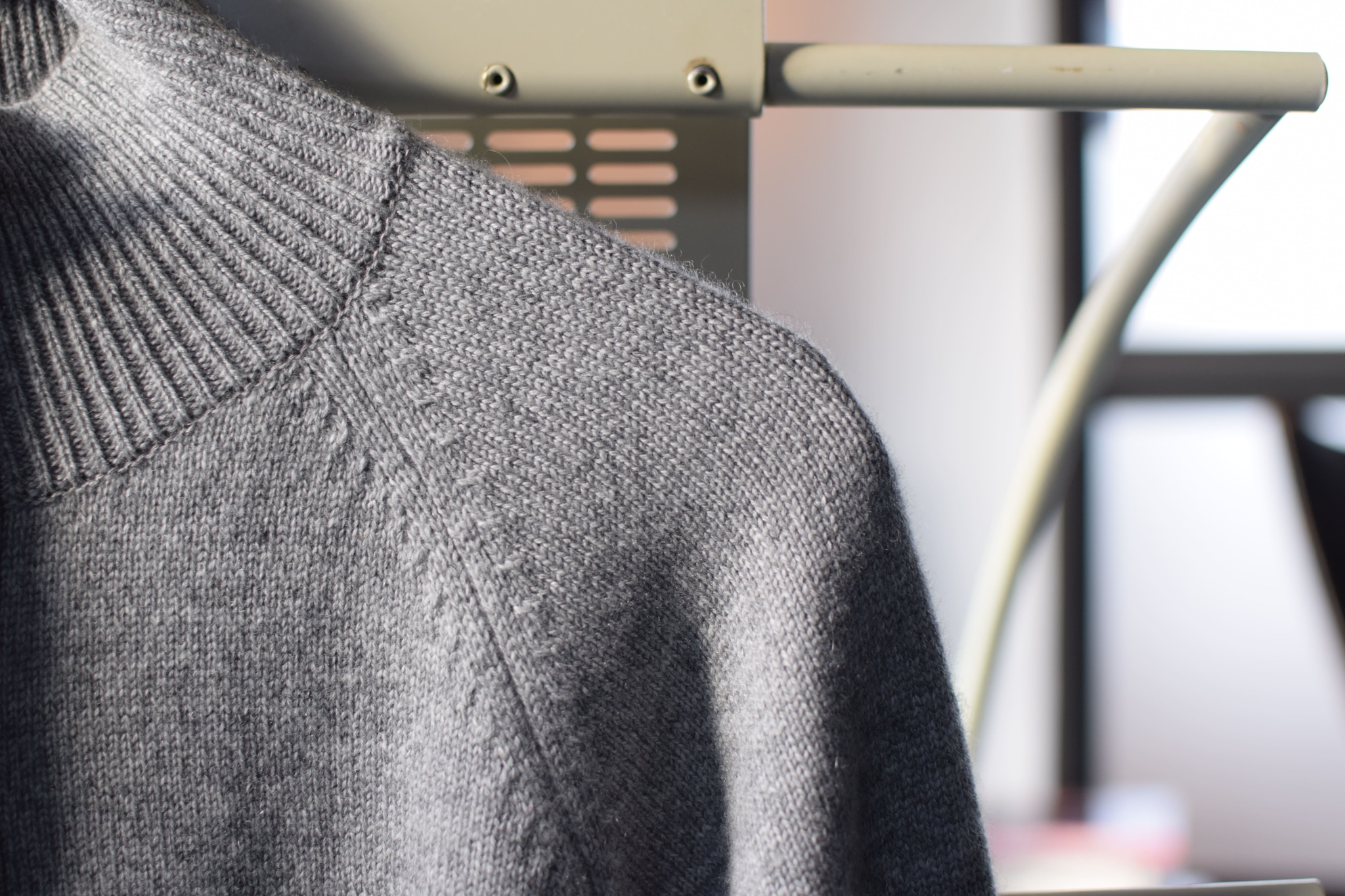 ラグランのショルダーはセットインに比べインナーのアイテムの着膨れを抑え、見え方を良くします。
