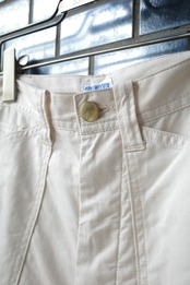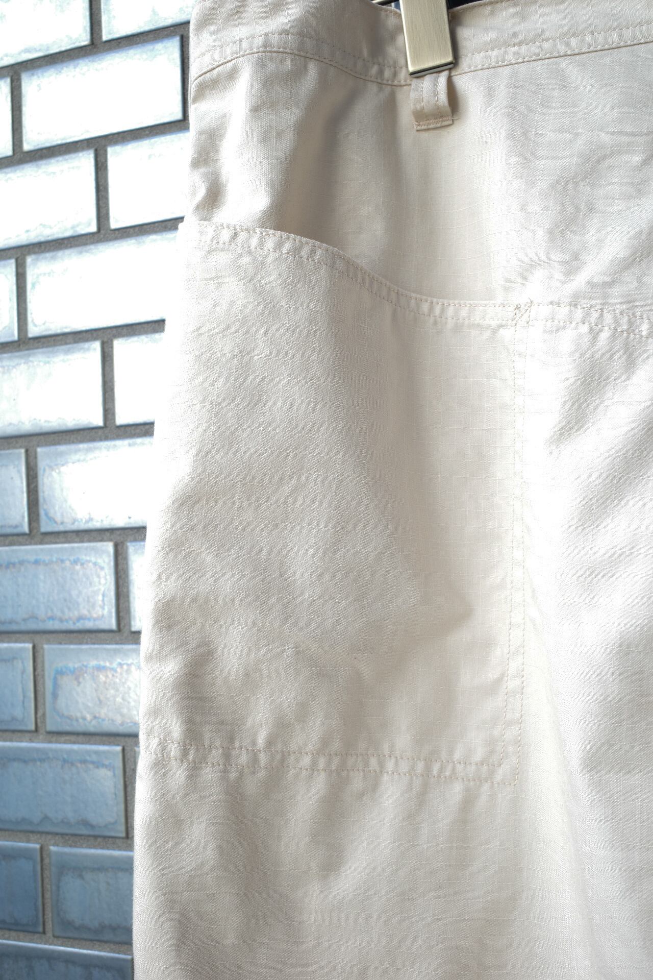 直線的なカッティングと、リップストップの格子の組み合わせが、その二面性を生み出している要素。ダブルニーと共に四角く型取られた腰ポケットも、どこかベイカーパンツ然としていて、その特徴を後押ししています。