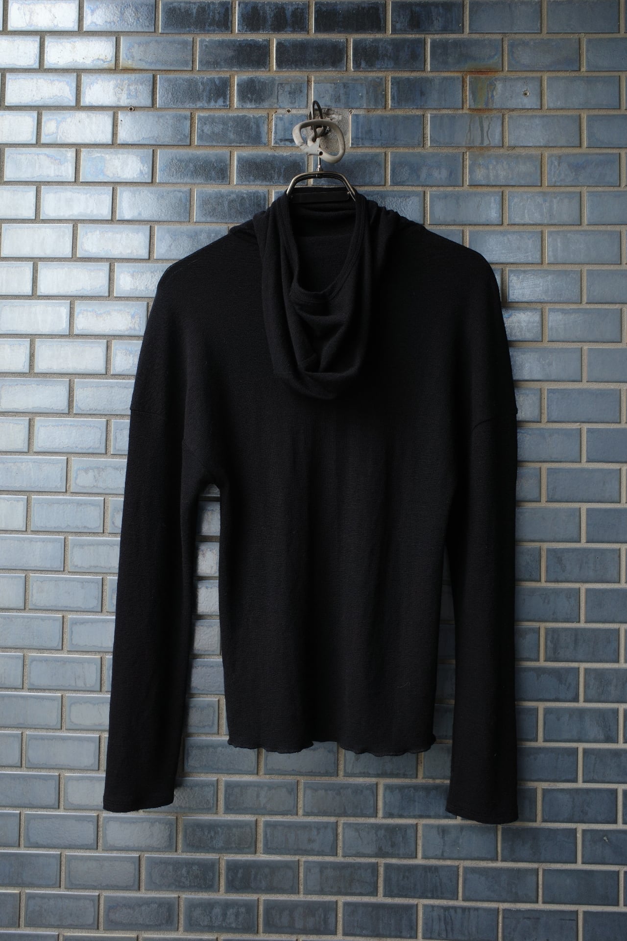 シンプルな中に上品なニットソーながらフード仕様の一枚。