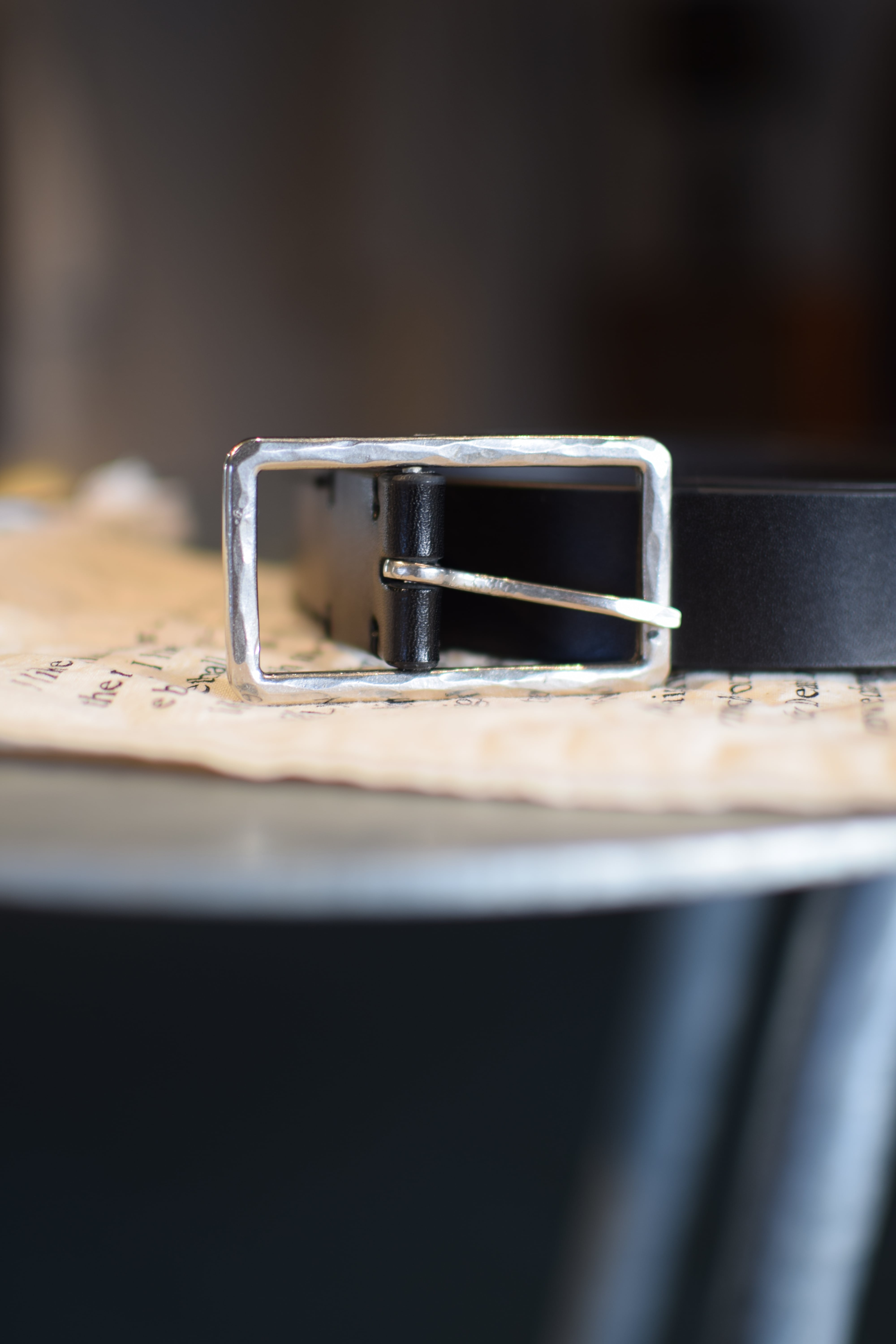 バックルは真鍮素材をハンマーワークによるランダムに打ち込みがなされている。